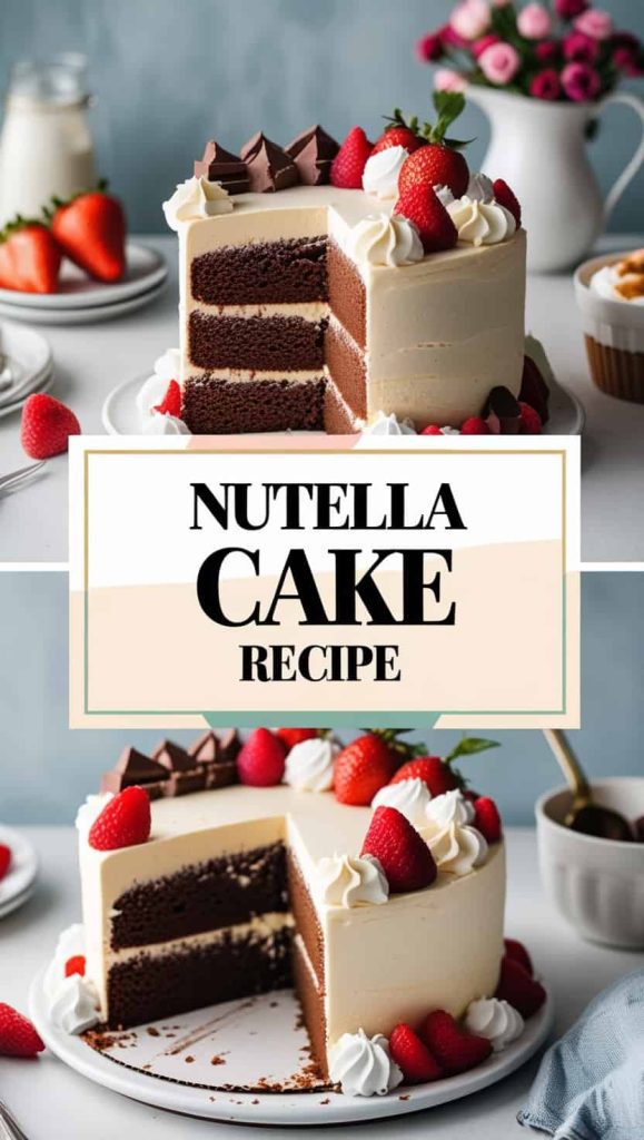 Instructions: Whisk eggs, sugar, and Nutella. Fold into dry ingredients. Bake, cool, and frost with Nutella buttercream. Decorate with chopped hazelnuts and a glossy Nutella drizzle.