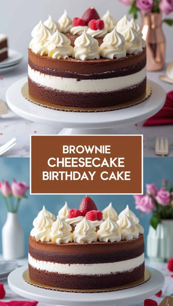 Instructions: Bake brownies in two pans. Sandwich with creamy cheesecake layer. Frost with ganache and birthday toppings.