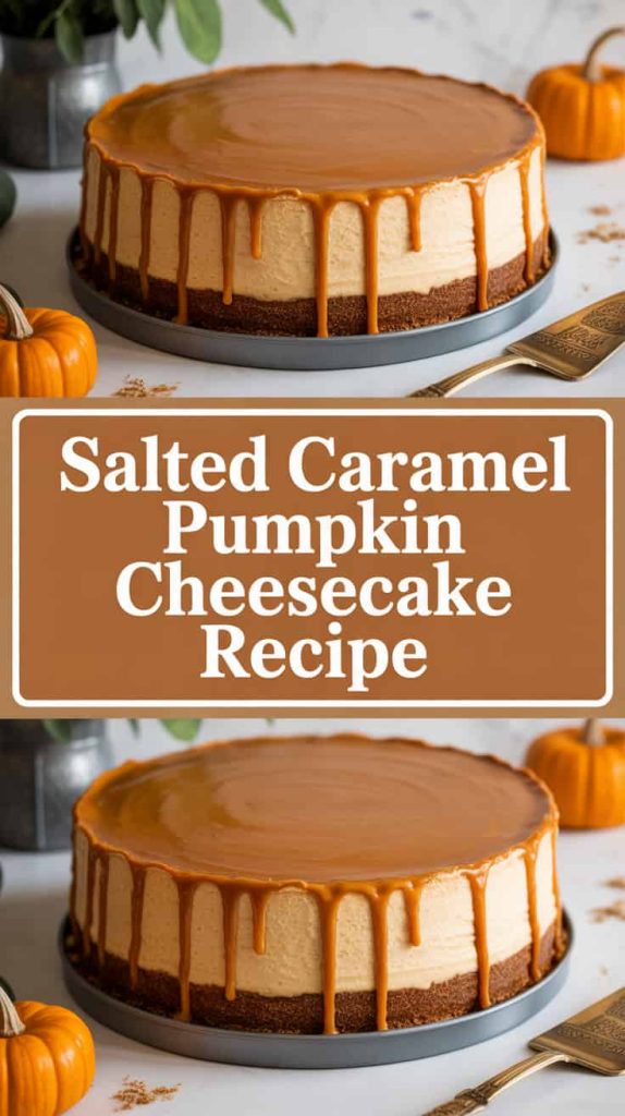 This cheesecake combines pumpkin spice, creamy filling, and a glossy salted caramel topping. The sweet-salt balance makes it perfect for holiday gatherings.