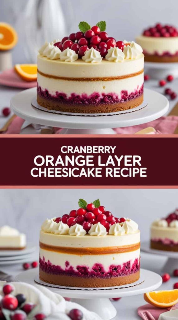 This cheesecake balances creamy filling with bright cranberry-orange layers for a fresh holiday dessert. It looks stunning on a Christmas table.