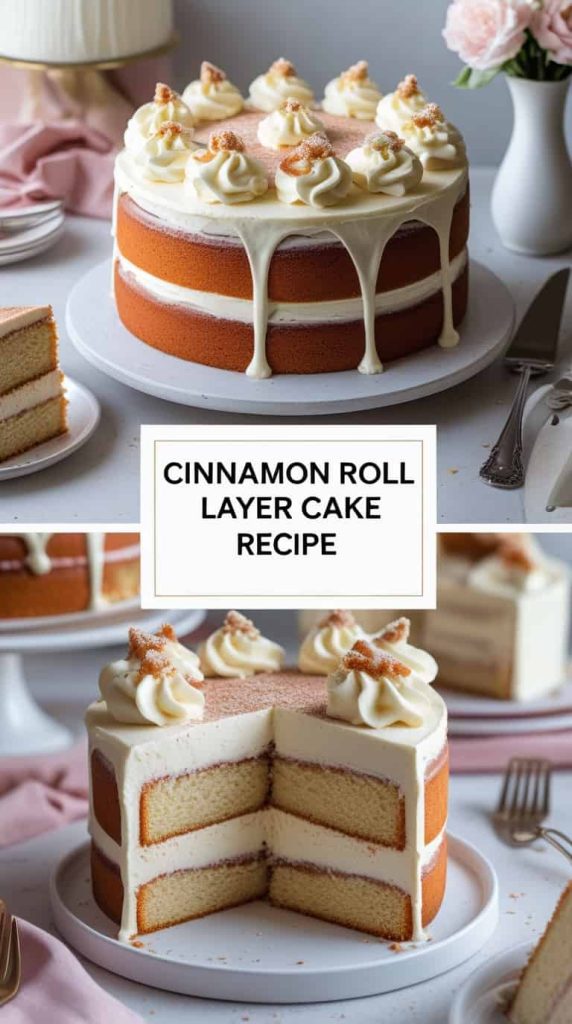 Cinnamon roll cake brings bakery-style warmth home. Soft vanilla layers are swirled with cinnamon sugar and topped with cream cheese glaze.