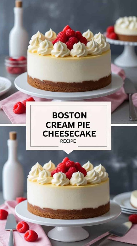This cheesecake blends custard, chocolate ganache, and creamy filling for a nostalgic bakery-style dessert. It brings together the classic flavors of Boston cream pie with the richness of a New York–style cheesecake.