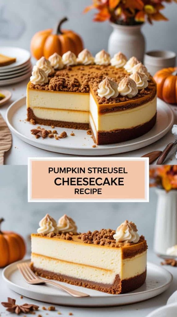 This cheesecake combines creamy pumpkin filling with a buttery cinnamon streusel topping. The contrast between smooth cheesecake and crumbly topping makes it a fall favorite.