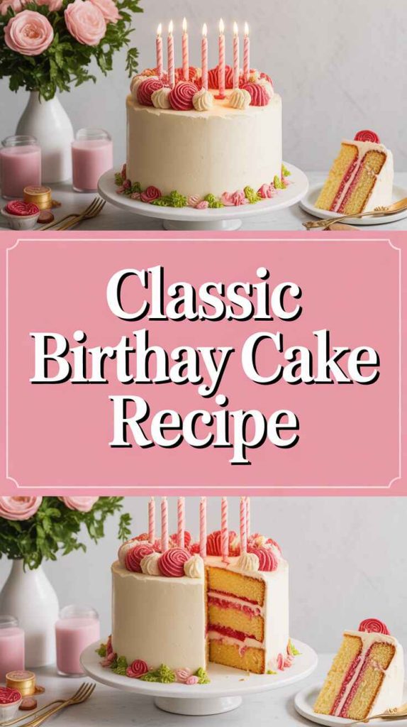Classic birthday cake features soft vanilla layers with creamy buttercream frosting. The crumb stays fluffy, moist, and perfect for candles.