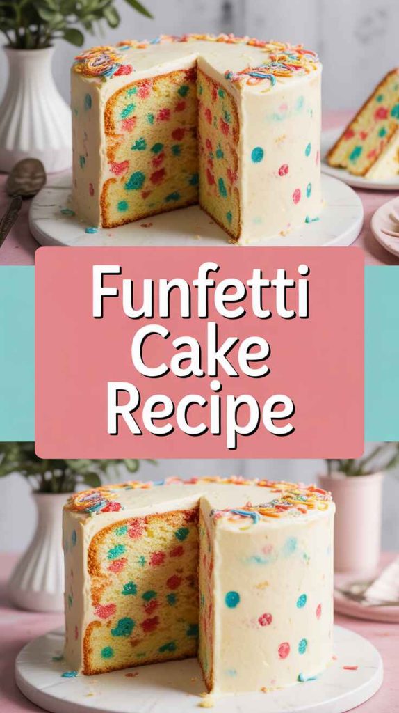Funfetti cake includes colorful sprinkles folded into vanilla batter for a festive crumb. The texture stays light and playful.