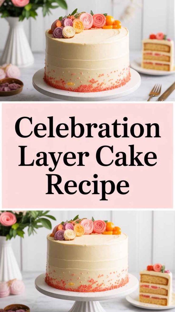 Celebration layer cake uses multiple stacked layers with smooth frosting for dramatic presentation. The structure holds beautifully when sliced.