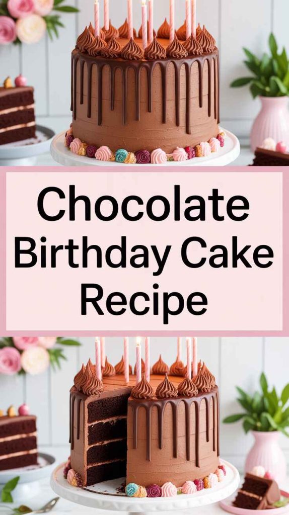 Chocolate birthday cake features cocoa-rich layers with soft texture and deep flavor. The cake pairs beautifully with creamy frosting.