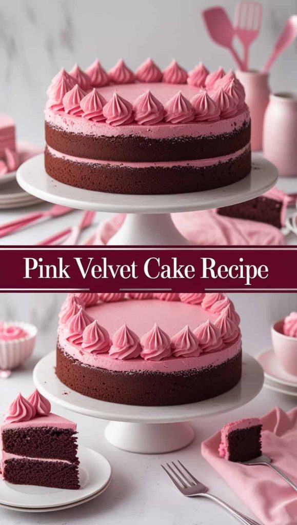 A pink velvet cake offers the same moist, tender crumb as red velvet, but with a lighter and more playful twist. Its subtle vanilla flavor and creamy frosting make it perfect for birthdays and showers.