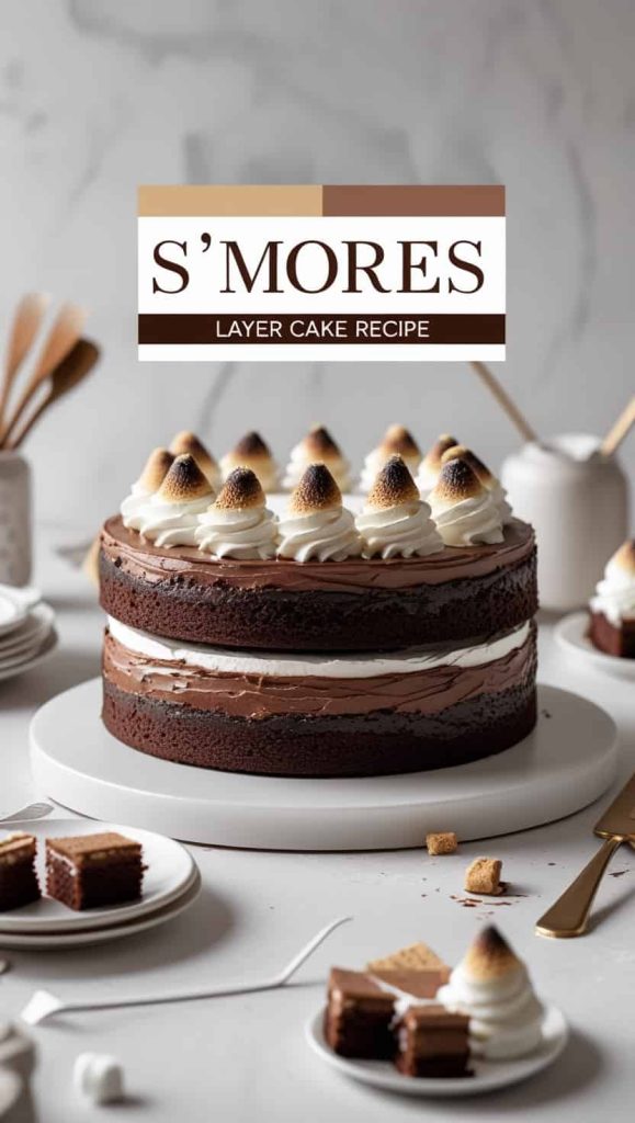 A playful twist on campfire s’mores, this cake layers chocolate, marshmallow frosting, and graham cracker crumbs.