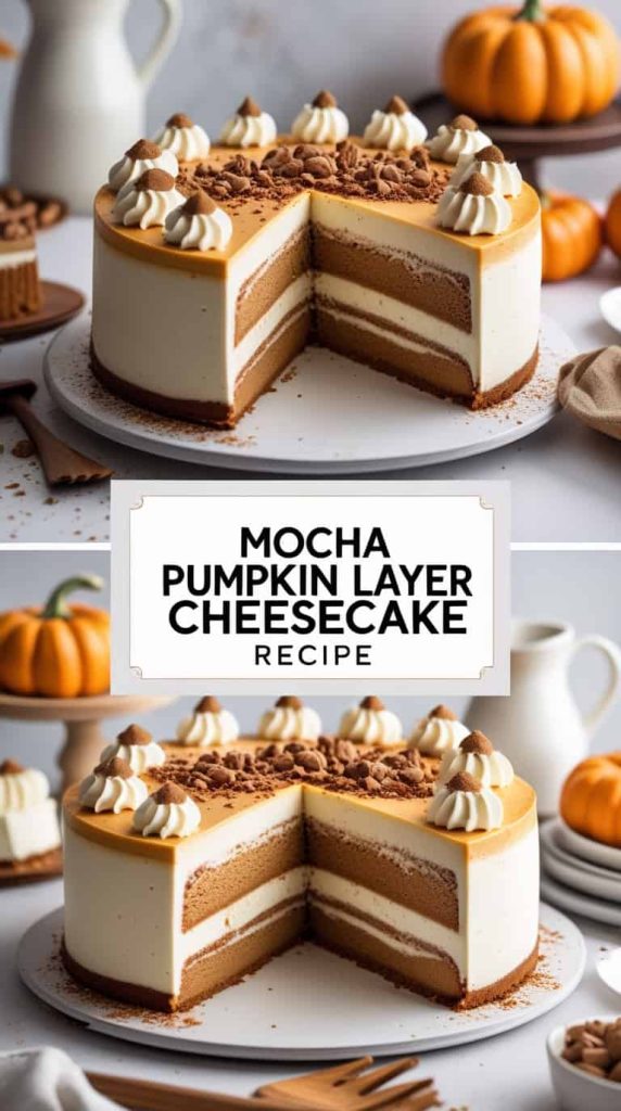 This cheesecake blends espresso, chocolate, and pumpkin into a smooth layered dessert that feels cozy and bold at the same time. The mocha base adds depth while pumpkin keeps the texture soft and balanced, making it ideal for fall gatherings and holiday dessert tables.
