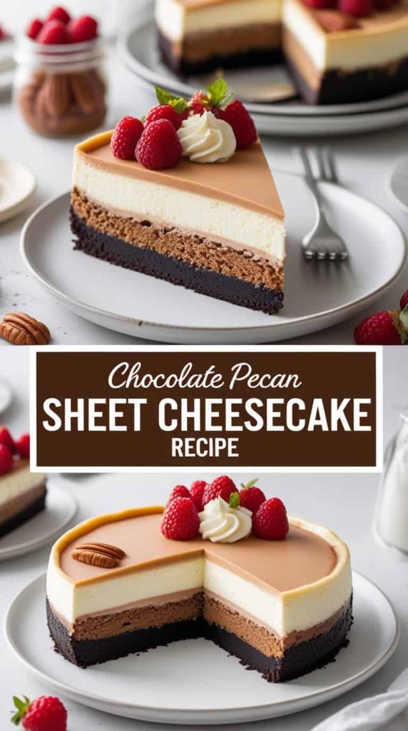 This sheet-style cheesecake pairs chocolate cheesecake filling with toasted pecans for a dessert made to share. The slab format makes it practical for parties while still tasting bakery-level rich.