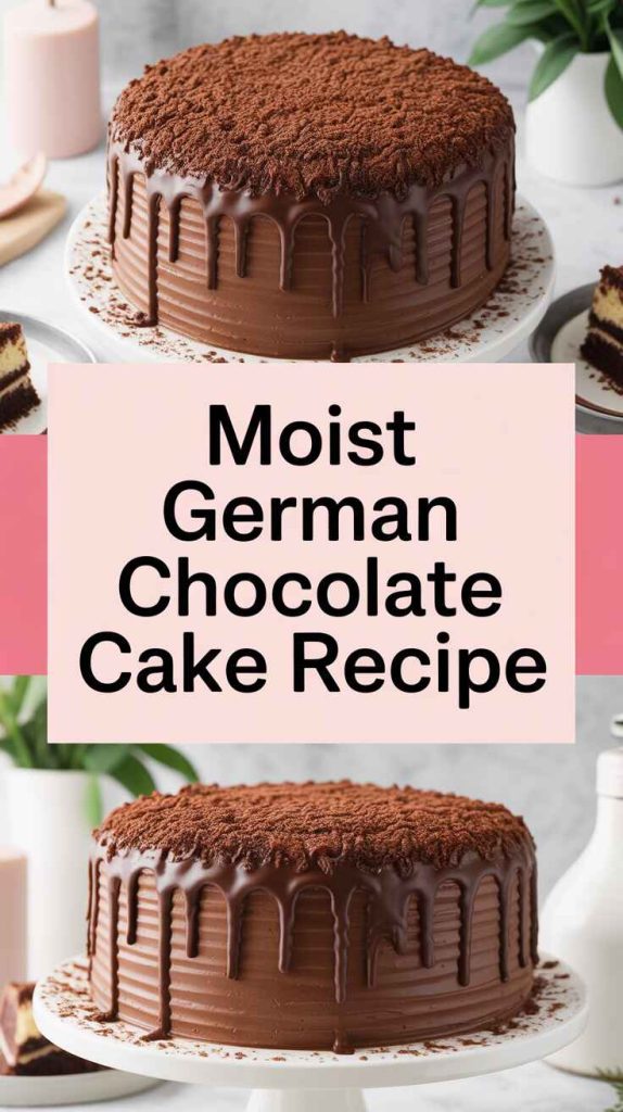 Moist German chocolate cake focuses on soft crumb and rich cocoa flavor.