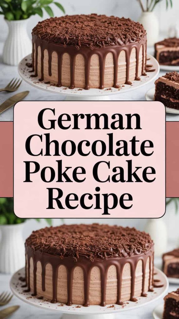 German chocolate poke cake adds caramel-like richness soaked into chocolate cake.
