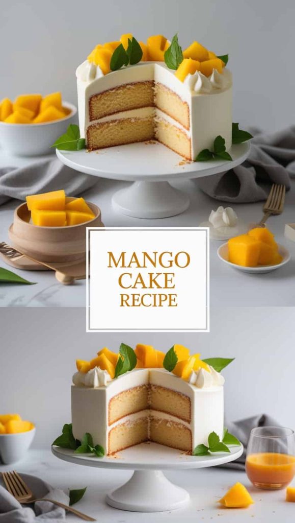 Bake the mango-flavored cake in two round pans. Cool completely, then frost with whipped mango cream and decorate with mango slices or puree swirls.