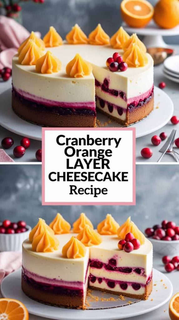 This layered cheesecake pairs tart cranberries with fresh orange flavor for a bright holiday dessert. The contrast keeps the cheesecake balanced and visually striking.