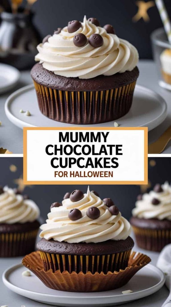 Factual summary: These mummy cupcakes use chocolate sponge, vanilla frosting, and candy eyes to create an easy spooky effect.