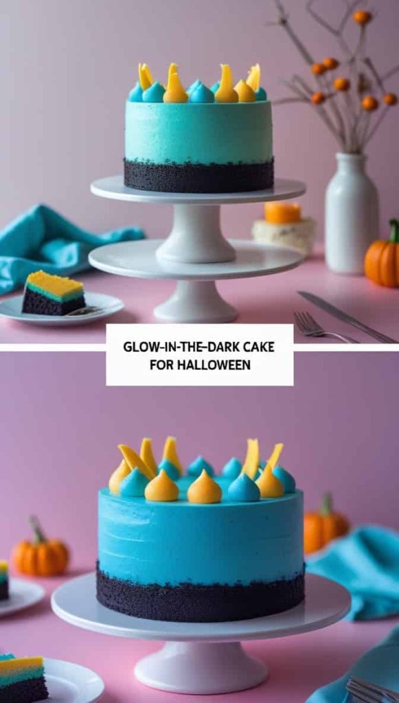 A Glow-in-the-Dark Cake adds a magical neon touch to your Halloween night using tonic water and blacklight effects.