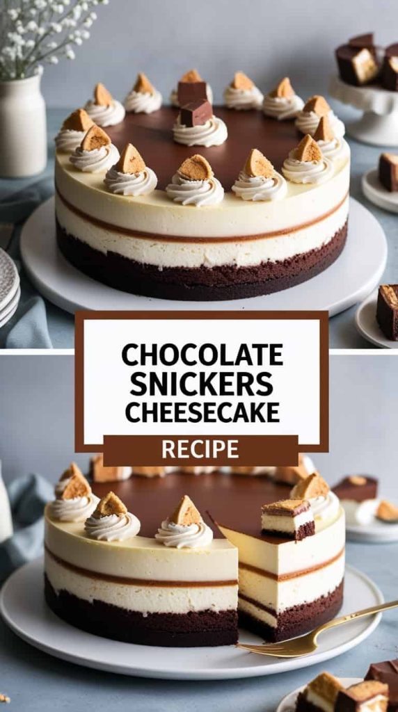 This cheesecake blends chocolate, caramel, and peanuts into a candy-inspired dessert. The mix of creamy filling and crunchy toppings keeps every bite interesting.