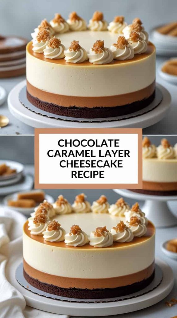 This cheesecake layers smooth chocolate filling with buttery caramel for a balanced, bakery-style dessert. The layered look makes it perfect for celebrations.